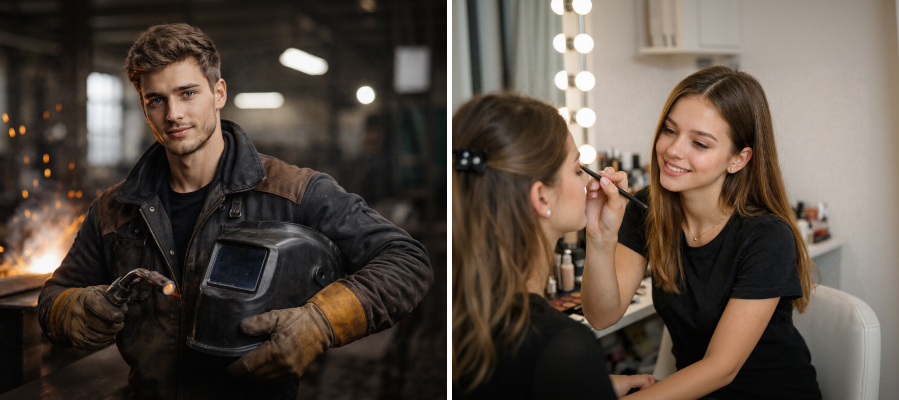 Эти профессии относятся к рабочим и творческим специальностям, где теория сочетается с практикой рук. Сварщики соединяют металлы в строительстве, машиностроении, на заводах и в нефтегазовой отрасли; машинисты управляют поездами (локомотивами, электропоездами) или тяжёлой техникой (экскаваторы, краны); косметологи ухаживают за кожей, проводят процедуры омоложения и лечения в салонах или клиниках; визажисты создают макияж для съёмок, свадеб, подиума; стилисты подбирают образы, работают с волосами, одеждой и имиджем; хореографы ставят танцы для театров, шоу, студий или клипов. Большинство этих профессий осваивают в колледжах (СПО), а не в вузах, это быстрый путь к работе (2-4 года обучения). Высшее образование встречается редко и не обязательно.
